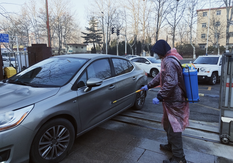 公司大门口严格登记,逐一对进入车辆驾驶侧门消毒